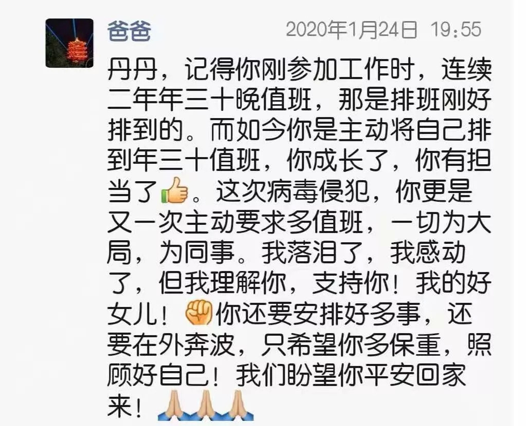 刘海生在微信群里发过这样一段感言:“老婆和孩子春节都在医院参加抗战疫情,心里压力好大!给自已和家人默默的鼓个劲,加个油。我们一定会平安的渡过疫情危机,抗战一定会取得胜利!祝家人安好,祝同学们安好,祝全国人民安好!对抗疫情!”