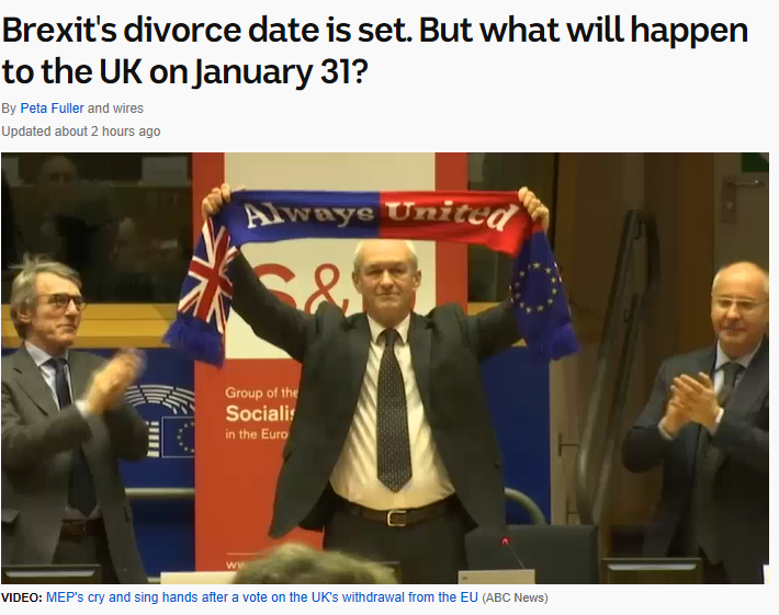 1月23日,英国女王伊丽莎白二世签署批准了英国议会此前通过的脱欧协议相关法案,24日,布鲁塞尔的两位高级官员——欧盟委员会主席和欧洲理事会主席共同签署了英国提交的脱欧协议。