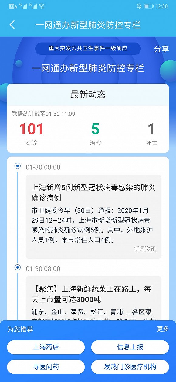 1月30日,上海市政府对广大市民朋友发起倡议:在疫情期间,如有相关办事需求,尽量使用“一网通办”在pc端、APP、小程序等多种渠道线上办事,避免集中到线下大厅办理,保护好自身的身体健康。