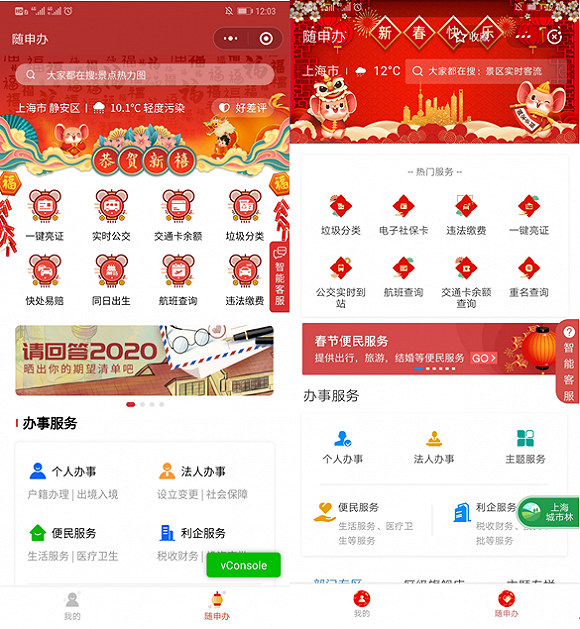 在微信和支付宝中,也可以搜索到“随申办”小程序。微信小程序还可以通过点击“上海发布”微信公众号下的“随申办”频道进入小程序,进行事项办理。