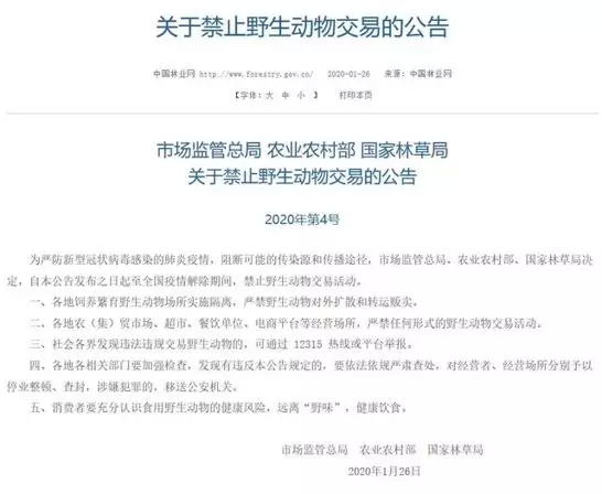 为此,国家市场监管总局、农业农村部、国家林业和草原局26日联合发布公告要求,即日起至全国疫情解除期间,禁止野生动物交易活动,以斩断病毒的传染源和传播途径。