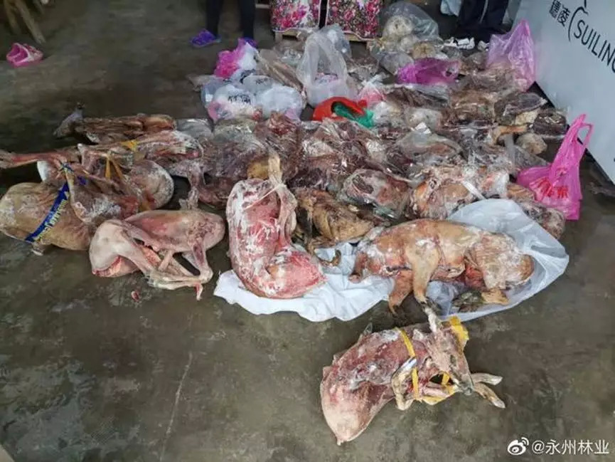1月27日上午,正在朋友圈兜售野味的湖南省永州市祁阳县羊角塘镇复兴社区的张某没有想到,祁阳县森林公安民警会如神兵天降一样出现在他面前。因为非法在网上经营野生动物,张某已被森林公安机关控制,现场查获10只河麂冻体、1头野猪冻体、10只竹鼠冻体、57只野兔冻体以及17袋200余羽鸟类冻体,8只鳄龟活体、两只草龟活体。
