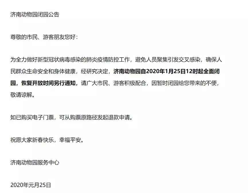 吉林、山东、湖北等地宣布叫停与野生动物相关一切交易和展演活动。陕西省林业局出台十项措施,确保人与动物的安全距离。1月22日起,武汉市动物园、九峰森林动物园等景区都已经暂停对外开放。原本计划春节不打烊的济南野生动物世界,从1月25日12时起就宣布闭园。饲养员每天按照既定的消毒制度,对笼舍及舍外活动场进行消毒。