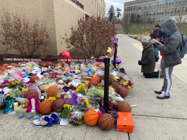 在科比的母校Lower Merion高中附近,人们留下卡片、鲜花、篮球、玩偶、球鞋等物件,在传奇开始的地方悼念传奇的终结。