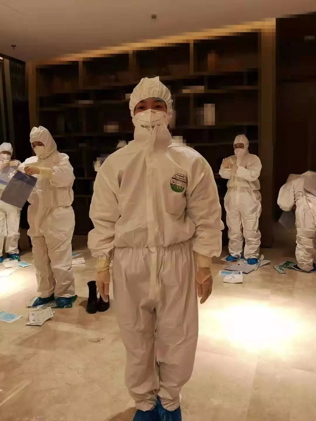 开始,我们对几个病人的抽血完成得很好,渐渐地护目镜和面屏有点起雾了,有点看不清血管了,只能通过手上戴的三层橡胶手套去摸索,我们的手显得很笨拙。