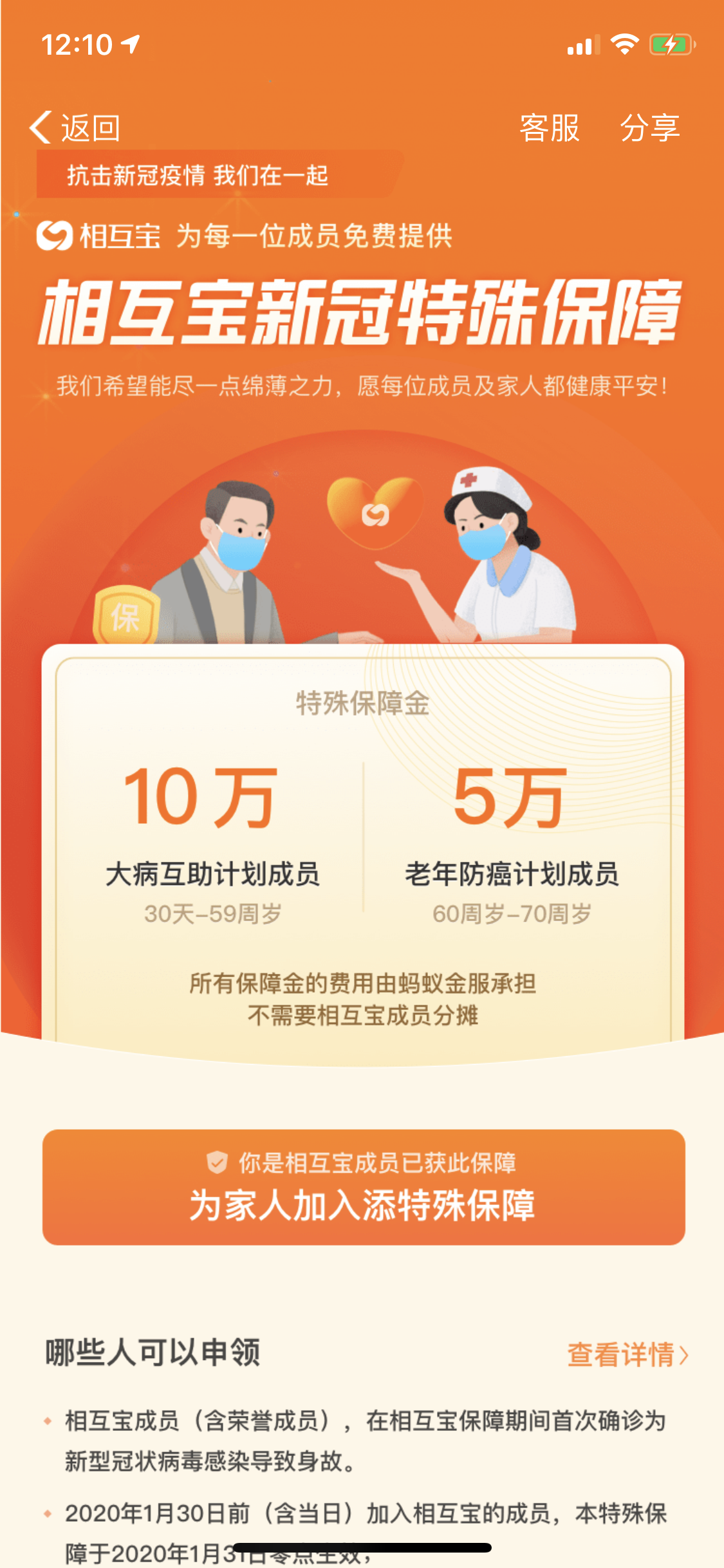 据介绍,“相互宝新冠肺炎特殊保障”参与者可以为所有相互宝成员,在加入相互宝后,若确诊新型肺炎并不幸导致身故,大病互助计划成员可申请最高10万元的新冠特殊保障金,特殊保障的所有费用由蚂蚁金服承担,不需要相互宝成员分摊。