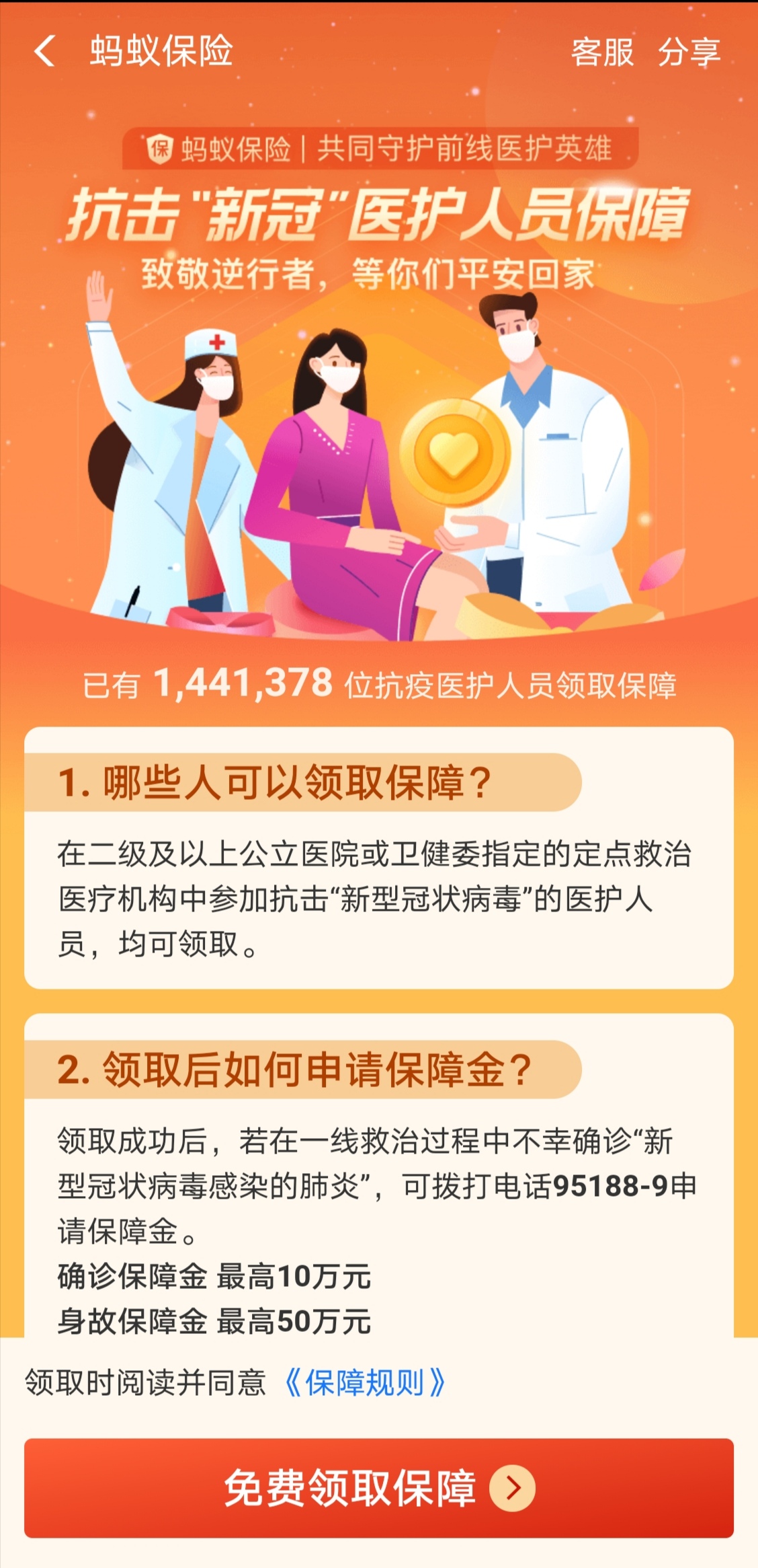 此外,支付宝平台上的抗击新冠医护人员保障也在数日前上线。医护人员若在一线救治过程中不幸确诊“新冠肺炎”,确诊保障金最高10万元,身故保障金最高50万元,医护人员可以免费领取。根据支付宝官方数据,截至2月1日,已经有超过144万名医护人员领取了该保障。