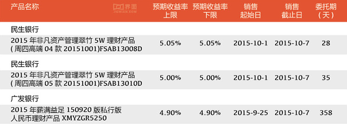 在认购起点5万元以上的理财产品中,这两款理财产品是收益率最高的。在此提醒投资者,这两款理财产品都不是保本的。此外,还应该注意,中信银行的这款理财产品募集期间过长,长达14天如果打算买的话,投资者选择在假期到期前2-3天去买就可以。另外,民生银行的这款理财产品委托期限只有28天,对于有时间和精力进行理财筹划的投资者来讲,是个不错的选择。