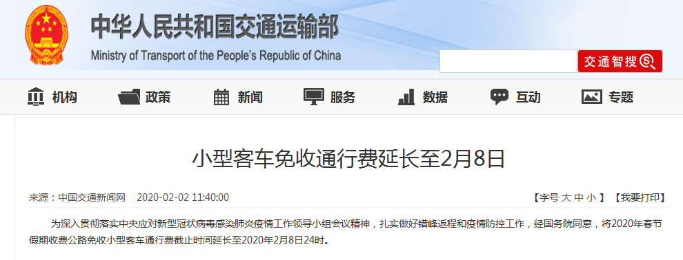为深入贯彻落实中央应对新型冠状病毒感染肺炎疫情工作领导小组会议精神,扎实做好错峰返程和疫情防控工作,经国务院同意,将2020年春节假期收费公路免收小型客车通行费截止时间延长至2020年2月8日24时。