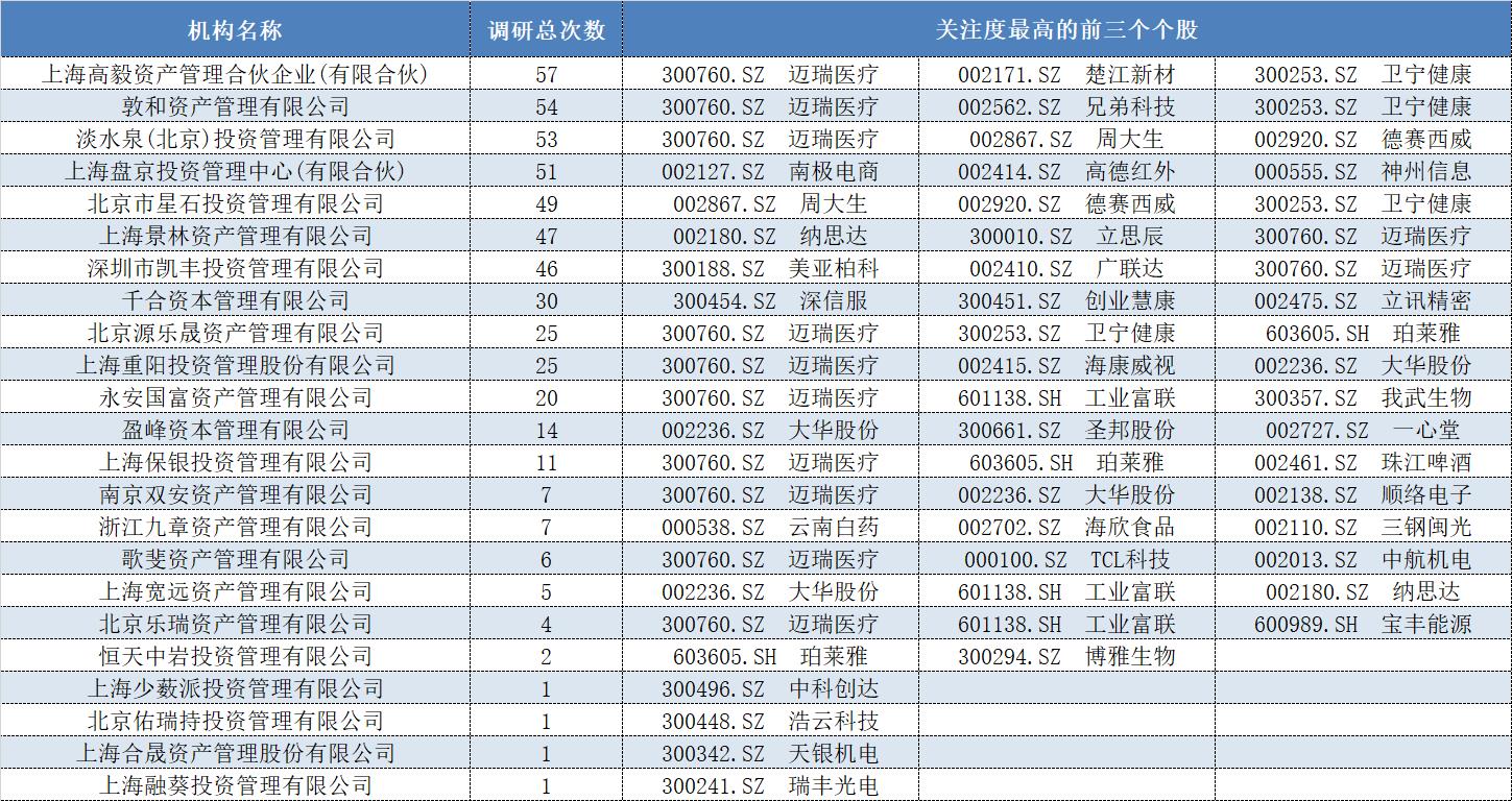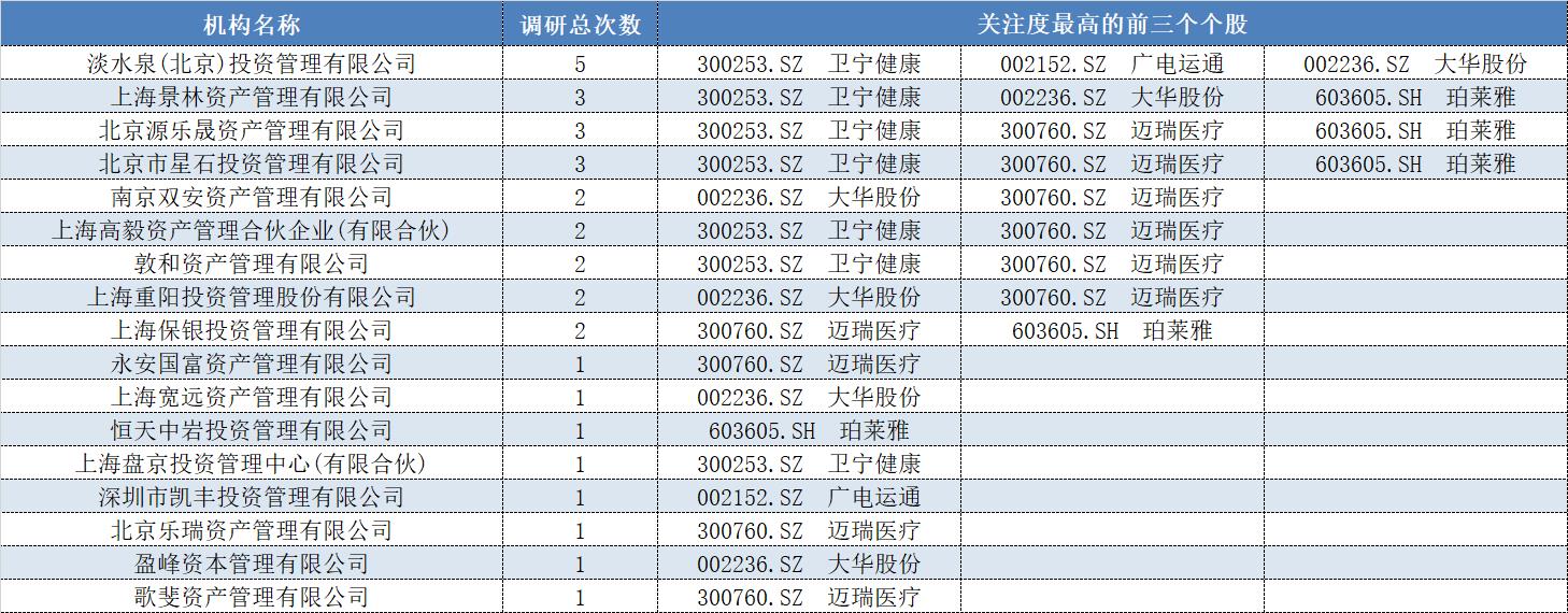 卫宁健康(300253.SZ)和大华股份(002236.SZ)分别获得四家百亿私募的重点关注。其中,高毅资产、敦和资产、源乐晟资产同时重点调研了迈瑞医疗和卫宁健康;重阳投资和双安资产同时重点关注了迈瑞医疗和大华股份。
