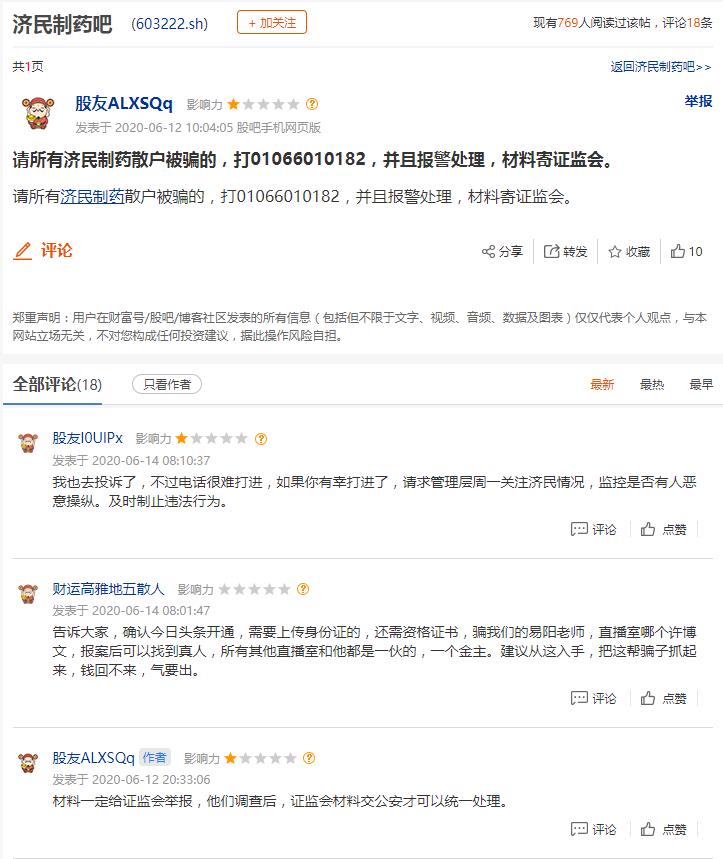界面新闻记者梳理发现,股吧的很多网友都表示在6月12日以前,曾通过直播、公众号、股票群等途径听信各种各样的“老师”荐股,重仓买入了济民制药。