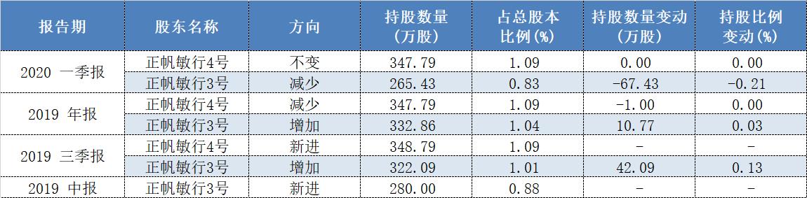 2019年年报时,“正帆敏行3号”再度加仓济民制药10.77万股,“正帆敏行4号”小幅减仓1万股。今年一季度,“正帆敏行4号”持股数量未变,“正帆敏行3号”则大幅减仓67.43万股。