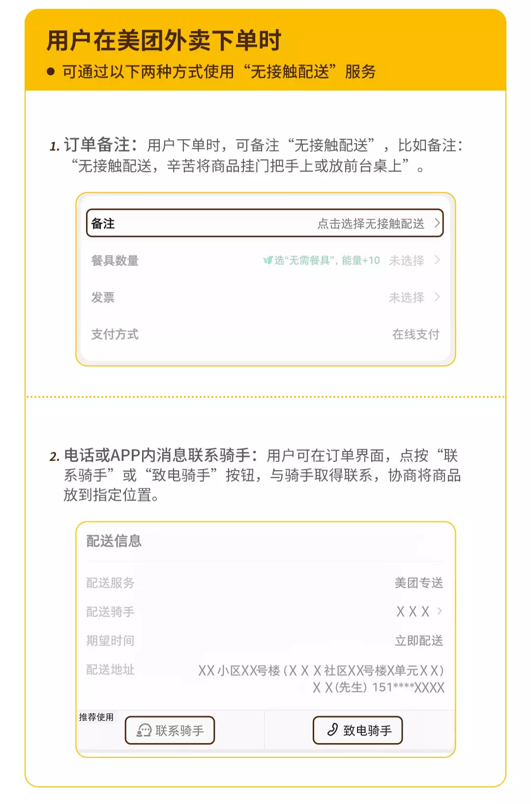 1月26日,美团外卖率先宣布,面对新型肺炎疫情,紧急在武汉试点推出“无接触配送”,建议用户提前约定好在公司前台、家门口等位置自行取餐;针对医院的送餐,则是通过取餐柜等无接触设备送达。该服务模式此后迅速覆盖184个城市,预计将在一周内覆盖全国。