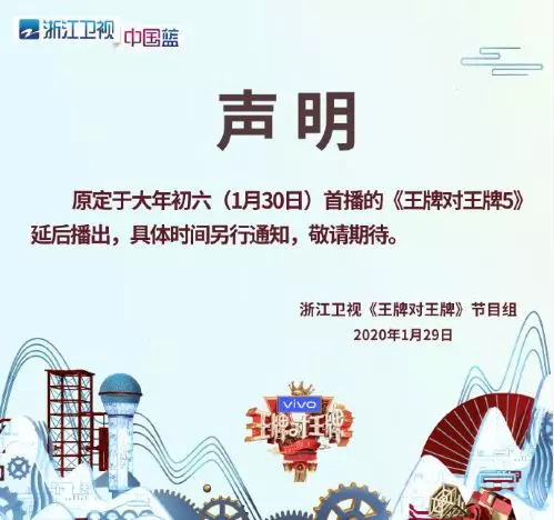 北京卫视的《了不起的长城》,第四期延期至2月8日播出;东方卫视的蹭饭综艺《亲爱的来吃饭》同样声明延期,且复播时间不明;《非正式会谈6》的节目组也发出声明,称新春特辑与第二期播出后,节目将暂时停播,复播时间待定;浙江卫视为周杰伦量身定制的魔术类真人秀《周游记》,也在近期宣布因不可抗力延期播出,