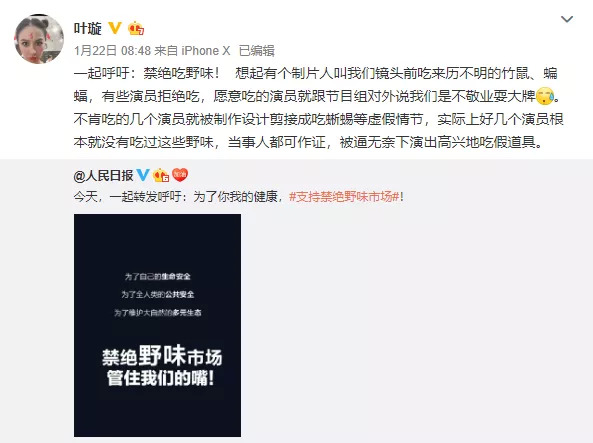 受短视频内容制作风格影响,这几年美食综艺不再局限于棚内录制,更追求新奇特,在食材上也奇招迭出。叶璇此前便在微博爆料,称在节目录制中遭遇强迫明星嘉宾吃野味的往事。后又有网友贴出当期节目视频,蝙蝠、蜥蜴、竹鼠等都是节目中的烹调食材。