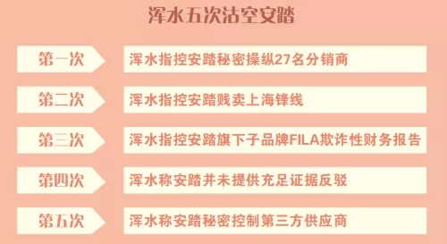 2019年7月8日,浑水在官网发布沽空报告,质疑安踏利用大量一级经销商操纵财务报表。“我们有证据证明安踏秘密操纵27名分销商,当中至少25名为一线分销商,其数量占到安踏总销售额的70%上下。”浑水表示,安踏声称其一级分销商是独立的第三方是个谎言,安踏利用许多秘密控制的一级分销商,欺骗性地提高了利润率。