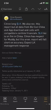 2月1日,另一家知名做空机构香橼(Citron)通过社交媒体声称,收到同样一份匿名报告,但认为“该报告并不准确”,瑞幸咖啡在中国“生意火热”。香橼还补充称,通过App下载、其他数据以及“和竞争对手的交谈”可以确认财务状况,“尊重浑水,但这个匿名报告不准确。”