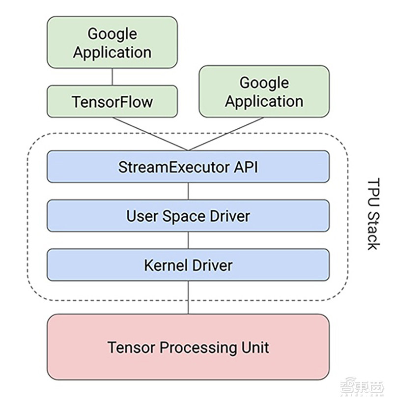 为了能进一步对TPU进行编程,谷歌还创建了一个编译器和软件堆栈,能够调用TensorFlow图中的API,转化成TPU指令。