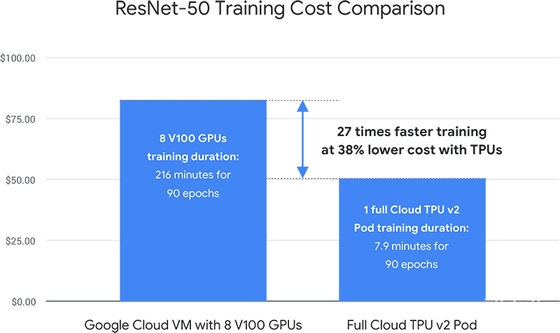 据悉,在相同配置(265块TPU)下训练ResNet-50模型时,第二代TPU Pod需要11.3分钟,而第三代TPU Pod只需7.1分钟。