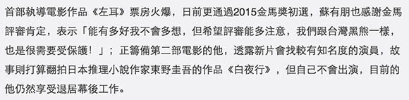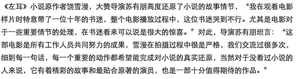苏有朋去年8月开始执导饶雪漫的“青春疼痛”小说《左耳》,该电影已于今年4月上映,最终票房4.95亿,被称为是苏有朋处女作的奇迹。这部勾起影迷“初恋回忆”的电影,被饶雪漫称赞“高度还原小说的故事情节”: