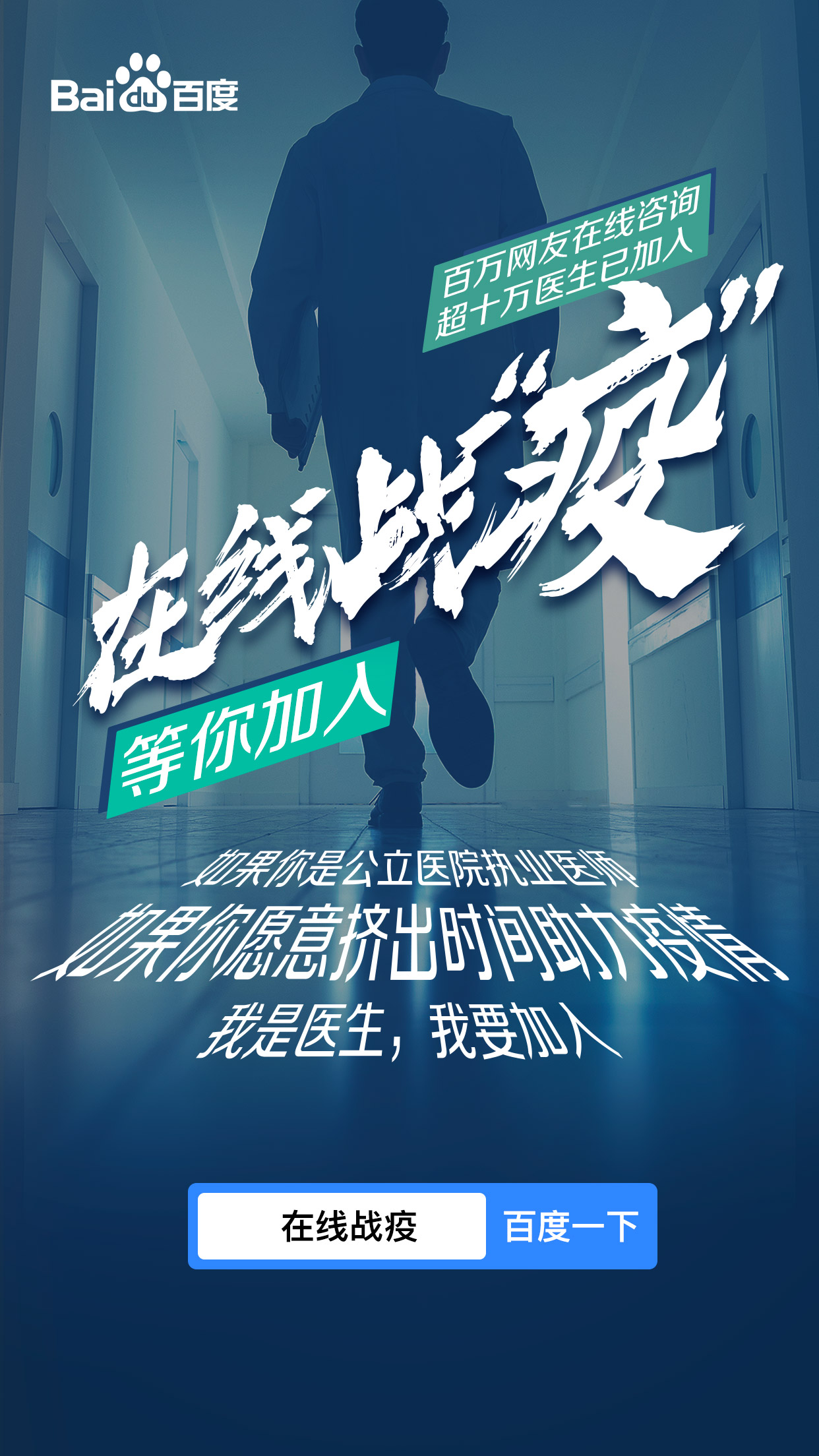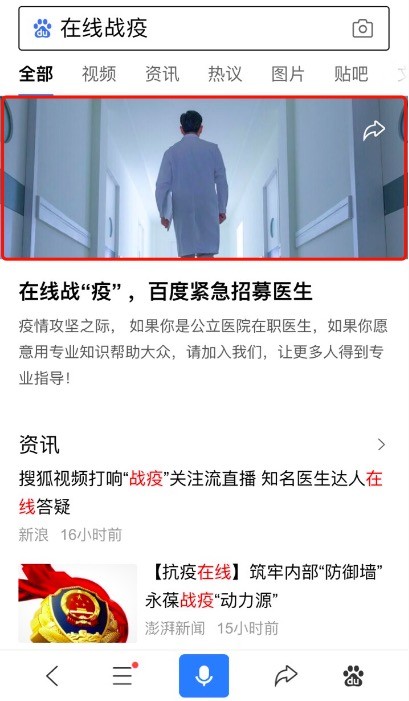 巨大的线上咨询需求意味着平台医生工作压力的增大,众多医生都是牺牲休息时间在线咨询。百度“问医生”医生招募渠道的启动,旨在呼吁更多的专业医生加入平台在线咨询,服务更多百姓,共同抗击疫情,共渡难关。医生通过百度App搜索“在线战疫”,点击顶部图片进行报名,审核通过后,即可加入平台为更多百姓提供帮助。