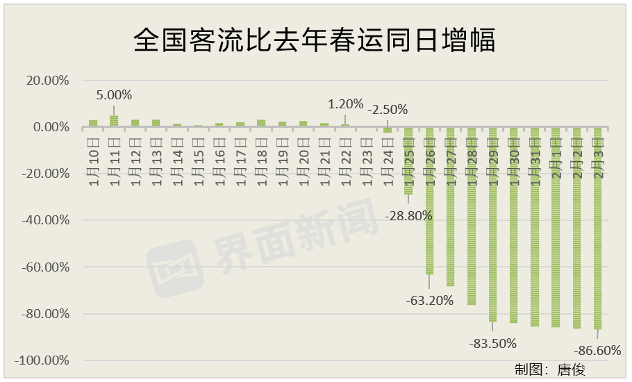 此后,政府部门呼吁公众减少出行,并推出免费退票措施。1月26日,全国客流同比降幅超过6成,1月29日开始客流同比降幅超过8成,从高峰时段的7000万下降至1000多万,此后直到2月3日的六天内,同比降幅均超过8成。