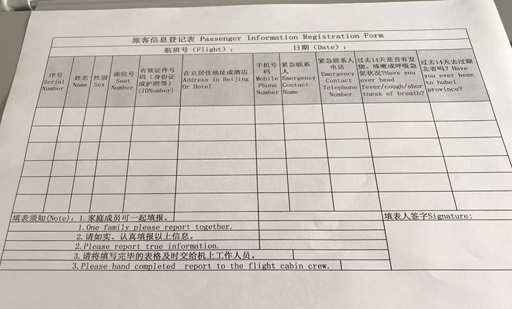 2月3日从四川绵阳乘坐飞机前往北京的刘女士告诉界面新闻,她在进出机场的时候都被检测了体温,并在飞机上填写了“旅客信息登记表”,登记了个人信息、在京居住地、过去14天的健康状况及旅行史。