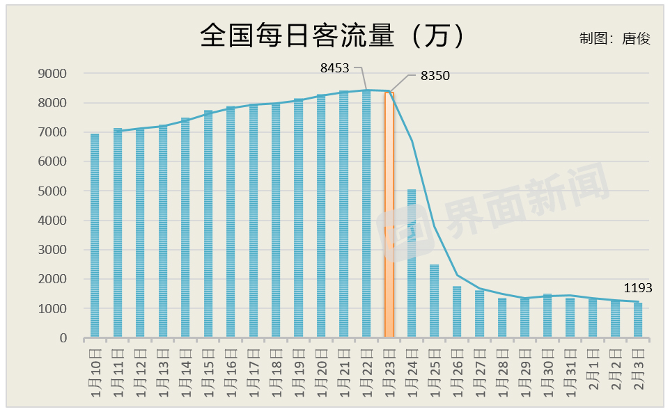 从1月10日开始的春运,到1月22日基本都保持了客流增长。1月23日凌晨,武汉宣布当天上午将“封城”,公众对疫情重视程度提高,当天全国客流出现拐点开始下滑。