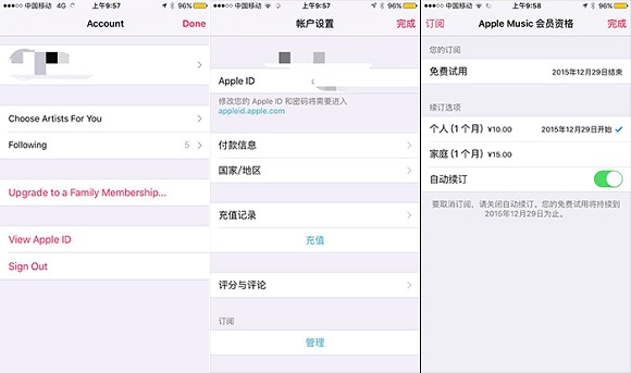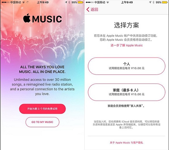首先让我们一起来看一下Apple Music,它一如既往地色彩鲜艳,推荐内容会根据用户设定选择的喜好进行推荐。第一次进入这个应用,它会出现3个月免费使用的选项,接着就需要选择3个月之后的订阅费用了。个人订阅将收取10元/月,家庭订阅(最多6人)将收取15元/月,到期自动续费。