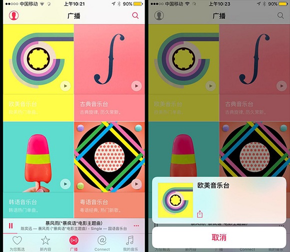 据此前苹果的消息显示,Apple Music拥有1500万海量的音乐版权,目前来看也都用上了。里面的歌曲也很丰富。广播一栏就比较考眼力了,模块颜色太鲜艳,而自体颜色又太清新,感觉是完全看不清楚的。可以长按,低端会弹出一个分享的框,可以看清楚栏目名字。