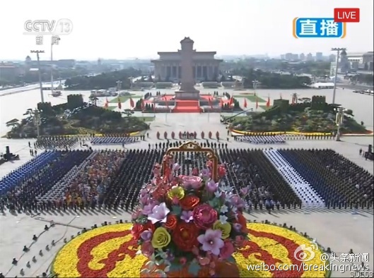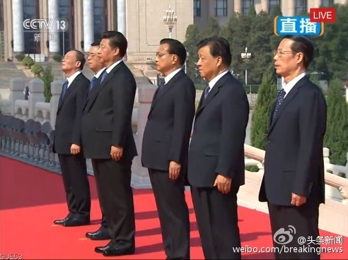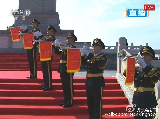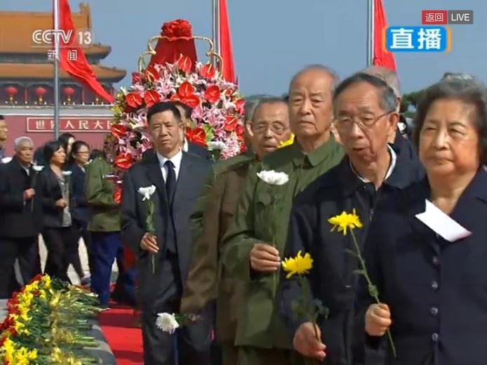 图片来源:央视截图2015年9月30日,天安门广场的向人民英雄敬献花篮仪式。