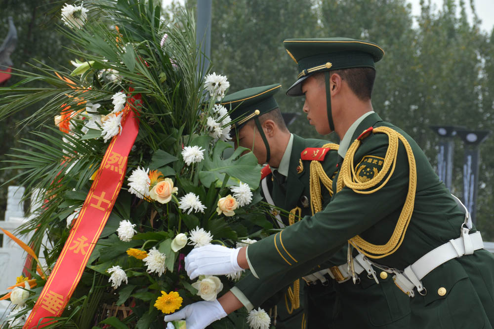 图片来源:CFP2015年9月30日,安徽省定远县,藕塘镇革命烈士纪念馆公祭活动现场,武警战士向先烈敬献花篮。