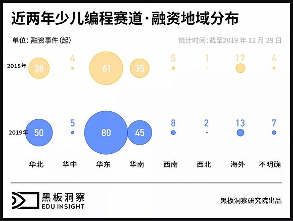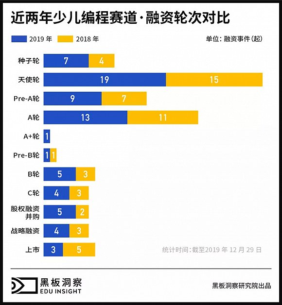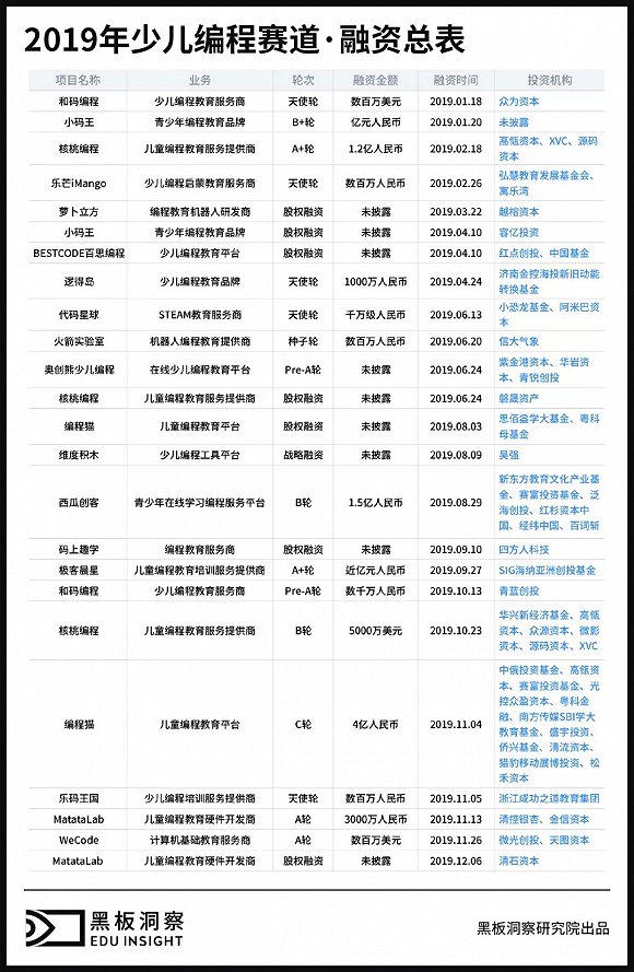 据黑板洞察统计,截止2019年年末,已有70项少儿编程项目完成了不同程度的投融资或上市。其中不乏核桃编程、极客晨星、编程猫等一众少儿编程项目,在行业赛道上策马扬鞭。