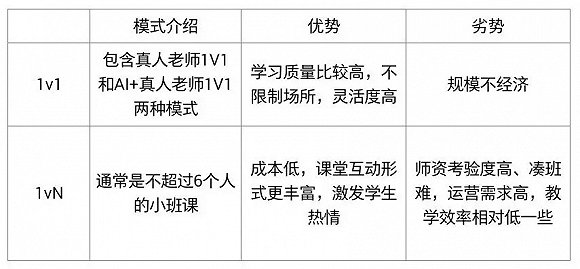 目前市场上的培训课基本上有1V1或者一对多的小班课两种模式。1V1教学效率高,其教学时间灵活,内容个性化定制,小班课课堂互动形式更加丰富,更容易调动学生学习积极性。