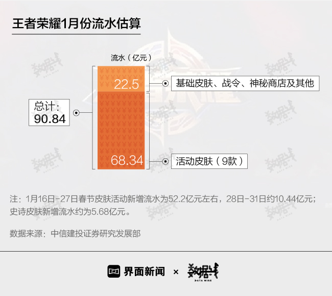 据中信建投估算,腾讯旗下的《王者荣耀》1月份流水或将高达90.84亿元,其中68.34亿来自9款活动皮肤的开卖。受益于春节期间的高DAU和高用户时长,其余22.5亿元收入来自于其他皮肤和战令进阶等日常活动。