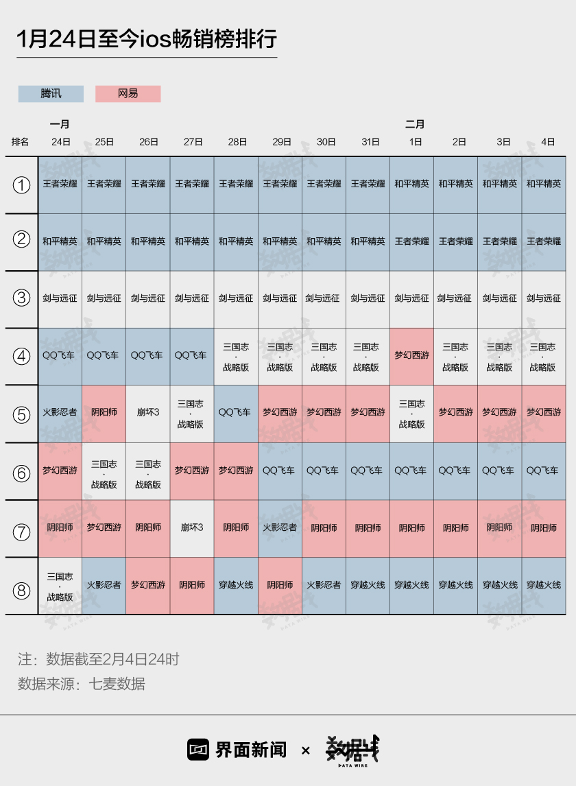 《王者荣耀》也并不是腾讯唯一的“圈钱利器”。从1月24日到2月4日的ios游戏畅销排行榜可以看到,《和平精英》从2月份开始一直占据榜首,超越《王者荣耀》成为“最吸金”的游戏。