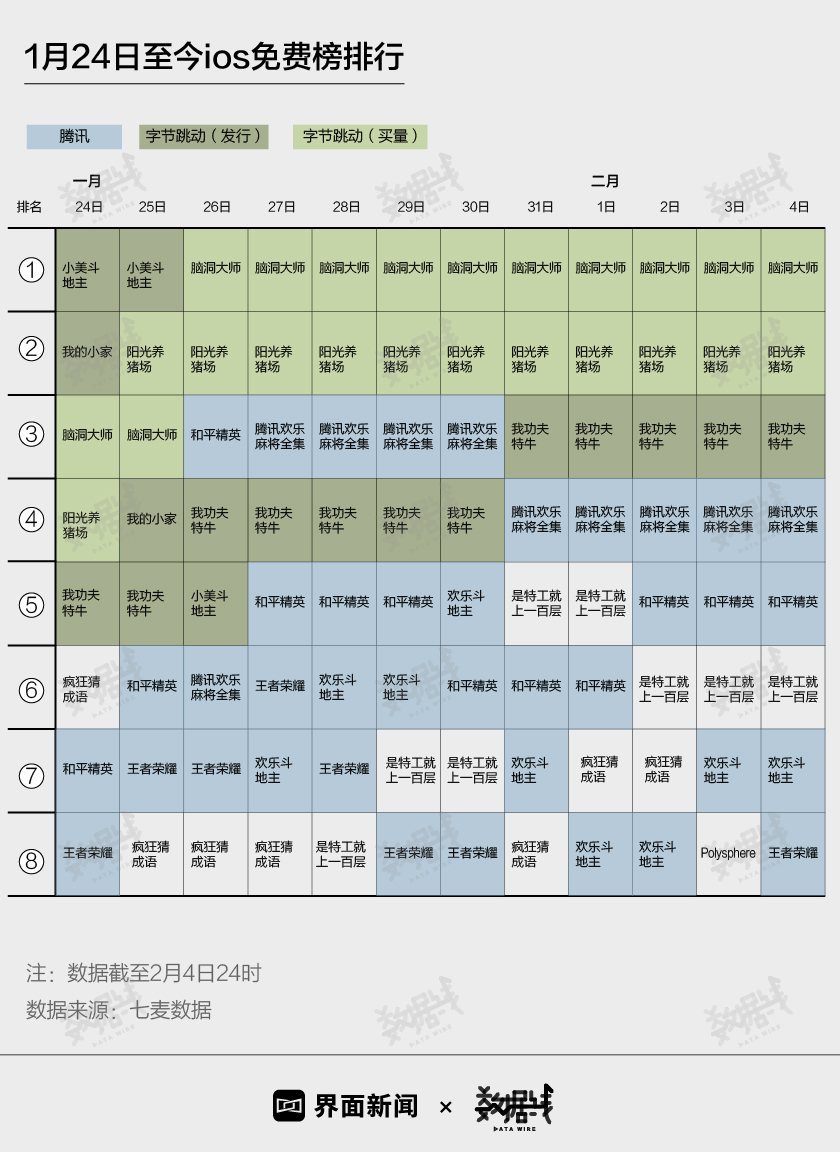 腾讯吸金,但是在流量上却让字节跳动超了车。七麦数据显示,1月24日-2月4日的ios免费榜排行上,在字节跳动发行/买量的游戏力压腾讯。从除夕夜开始,头条系的流量优势明显,先后有五款在字节跳动发行/买量的游戏上榜,并且一直包揽一二名。而无论是腾讯的《和平精英》还是《王者荣耀》,均未能突破头条系的“包围”。