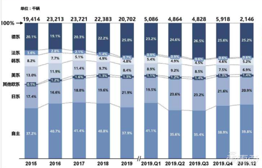 很明显,自主品牌在2016年、2017年、2018年这三年有一个不错的市场态势,但到2019年却有了明显下滑。