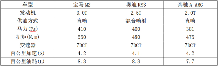 买性能车的人最在乎的是性能,性能比颜值和空间更重要。宝马M2、奥迪RS3和奔驰A AMG分别搭载3.0T、2.5T和2.0T发动机,除奥迪RS3采用混合喷射外,其余两款发动机都是直喷供油,宝马M2以输出410马力和550牛.米成为动力最强车型,但加速却不是最快车型;奔驰A AMG动力最弱。