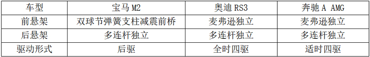 购买性能车不仅看重加速性能,也得在乎底盘驱动形式。宝马M2采用后驱设计,奥迪RS3采用全时四驱设计,而奔驰A AMG采用适时四驱设计。三款车的后悬架都是多连杆独立悬架,只有宝马M2前悬架是双球节弹簧支柱减震前桥,而奥迪RS3和奔驰 A AMG的前悬架都是麦弗逊式独立悬架。后驱车操控好,但四驱车操控更好,宝马M2的前悬架为不是四驱扳回了点分,但四驱无疑更适合性能车。