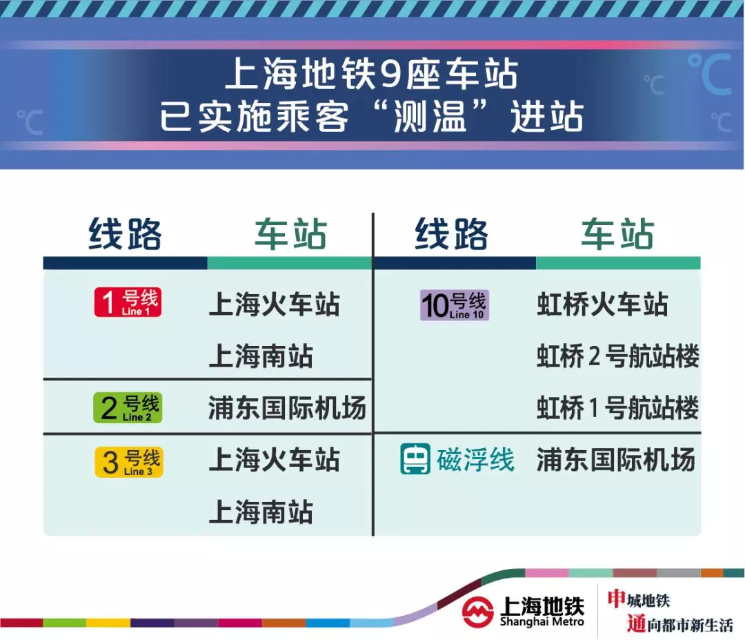 2月6日,上海地铁对外表示,为切实做好上海市疫情防控工作,应对春运返程客流及复工上班客流,将新增1号线新闸路站、2号线海天三路站、3号线宝杨路站等51座车站实施乘客“测温”进站。