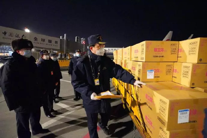 2月4日深夜,北京海关所属首都机场海关在机坪为用于防控疫情的临床试验药物办理快速进口验放手续。 该批药物为首次从国外进口,共计4322支,将用于湖北武汉金银潭医院新型冠状病毒肺炎患者临床试验研究。