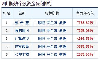 今日四川板块个股资金流向方面大盘股受到青睐,新希望及通威股份的主力资金净流入都达到7000万以上的高位,红旗连锁的资金净流入也接近5000万。