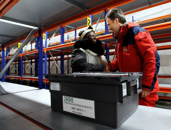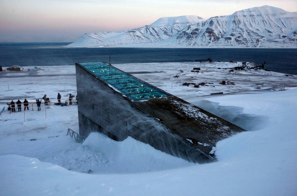 2008年2月25日,种子库成立的前一天,挪威朗伊尔城。斯瓦尔巴全球种子库的项目经理Magnus Bredeli-Pveiten站在种子库内。这座为“迎接”世界末日而建的仓库理应经受地震和核武器的打击,因此被建于北极一座深山里的永久冻土层之上,天然的地形优势将助此仓库保护数以万计的农作物种子免遭任何自然或人为的灾害。种子库于2008年2月26日正式启用,此时距施工人员在离北极1,000千米的挪威斯瓦尔巴群岛上打下建址的第一钻还不到一年。仓库最多能够容纳来自世界各地的450万个种子样本,令其摆脱气候变化、战争及自然灾害的威胁。