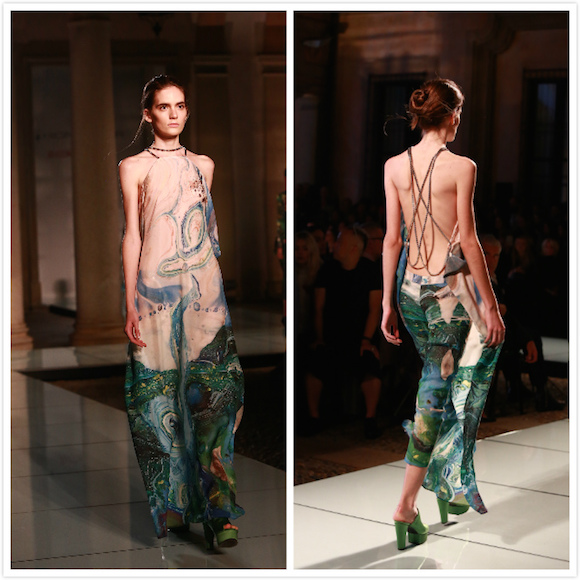 米兰时装周的京东秀场里,二楼还设有静态展。除了顾林外,还能看到京东设计师频道不久前签约的胡红焱自创品牌Ivy Hu。这位深受超现实主义艺术家达利影响的设计师通过服装与装置艺术展示了她眼中现实与梦幻相结合的状态。