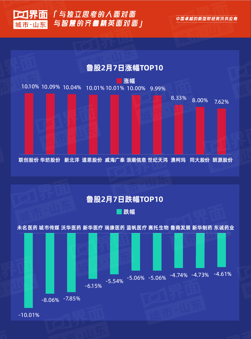 2月7日,山东省内沪深股票有119只个股上涨,73只下跌,14只与上一个交易日收盘价持平;总市值过千亿的有万华化学(600309)、海尔智家(600690)、潍柴动力(000338)、山东黄金(600547)共4家,500亿-1000亿的共有3家,分别是歌尔股份(002241)、青岛啤酒(600600)、浪潮信息(000977)。