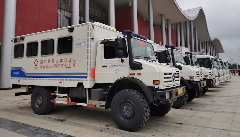 其中,东方医院整建制承建的国家紧急医学救援队暨中国国际应急医疗队(上海),除派出55名队员外,还配备了10辆专业车辆装载物资,包括药耗、生活保障、帐篷医院等共计30吨。
