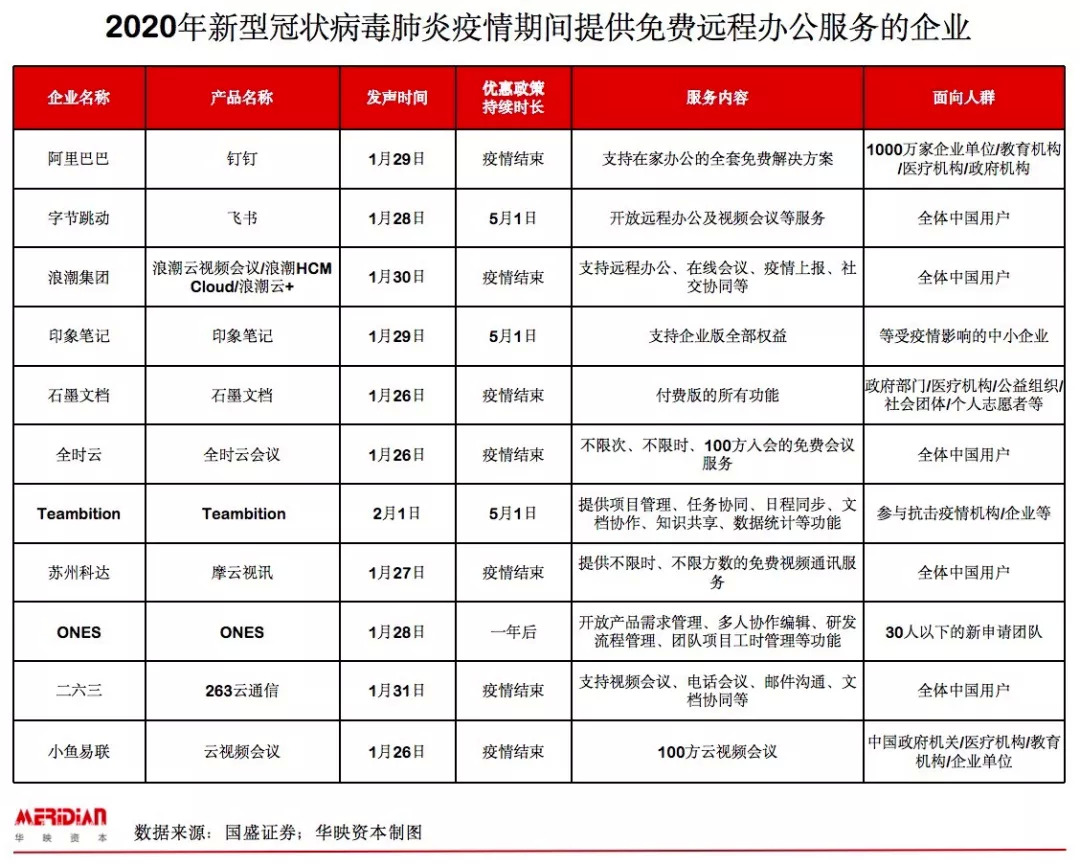 如华映所投资企业中,微盟为各个行业的企业提供智慧商业SaaS解决方案,帮助企业通过微盟的SaaS进行线上的用户和客户管理,疫情期间微盟启动了“同舟计划”助力零售企业提升线上经营能力对抗疫情危机。金柚网为企业提供一站式的线上的社保缴纳业务,助力疫情期间企业员工的社保不断缴,并且在疫情期间通过各类线上课程助力企业解决疫情引起的各类用工和复工问题,受到客户的广泛欢迎。另外,近期在线办公赛道的崛起也是典型案例: