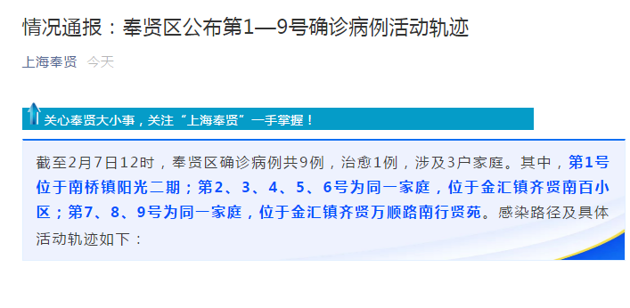 今天上午,奉贤发布了一份“奉贤区公布第1—9号确诊病例活动轨迹”,详尽描述了奉贤9名确证病患的关系图与出行轨迹。堪称上海目前为止最详尽的一份“轨迹图”,引来无数网友点赞。