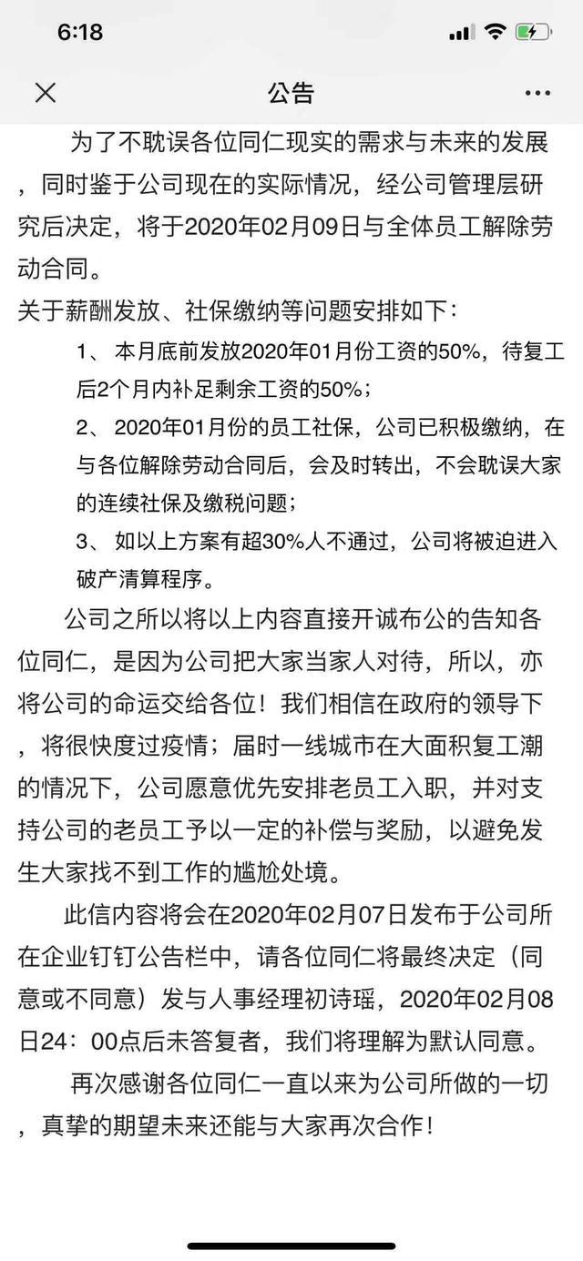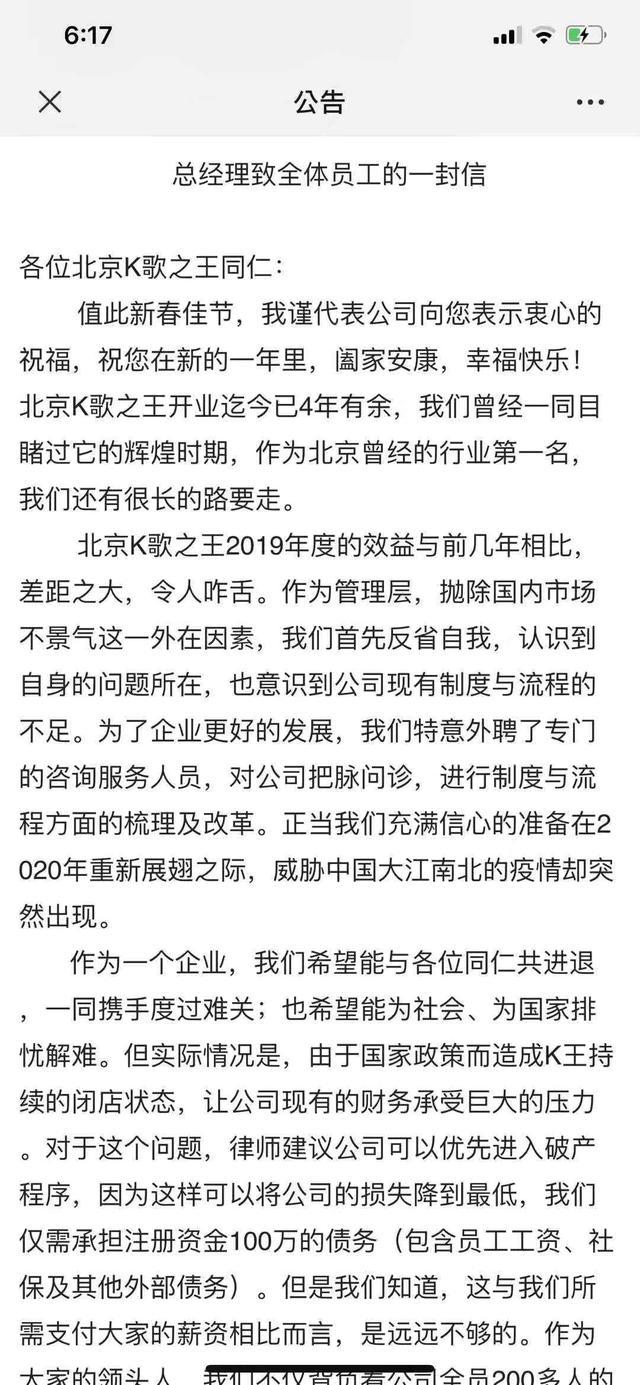 2月8日,一份北京K歌之王总经理致全体员工的一封信在网络上流出并登上了微博热搜。信中表示,北京K歌之王2019年度效益与前几年相比差距很大,由于疫情影响下持续闭店的状态,让公司现有的财务承受巨大压力,经公司管理层研究后决定,将于2020年2月9日与全体员工解除劳动合同。
